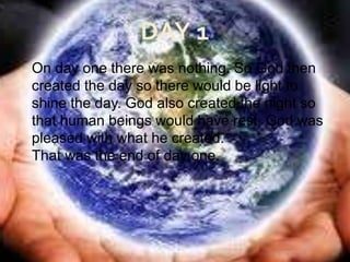 God created the world over six days according to the creation story. On each day God created a new part of the world and was pleased with his creation. On the first day God created light and separated day from night. On the second day God created the sky and sea. On the third day God created land and plants. God created the sun, moon, and stars on the fourth day. On the fifth day God created sea creatures and birds. On the sixth day God created land animals and the first humans, Adam and Eve. God rested on the seventh day. The document emphasizes that God created all living things and the world through his power as the creator.