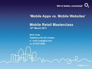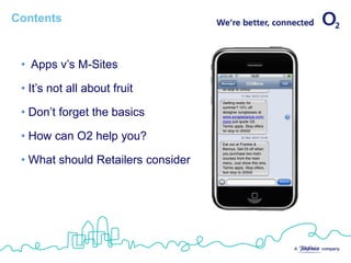 This document discusses mobile apps versus mobile websites for retailers. It notes that while mobile apps can provide an optimized experience and offline usage, they require more development resources and time than mobile websites. Mobile websites have wider reach since they don't require downloads and can be accessed by more users. The document also stresses that smartphones have a diverse user base, not just younger people, and to consider platforms beyond iPhone like Android and Blackberry. It encourages retailers to start mobile engagement but not be afraid to ask for help from mobile experts.