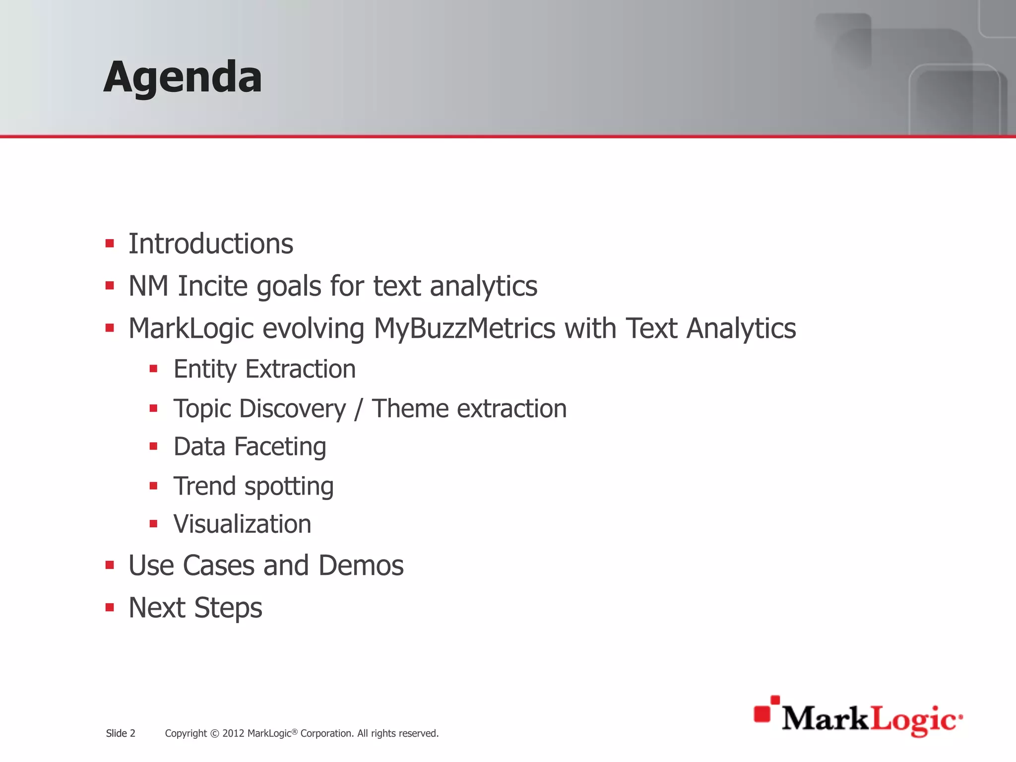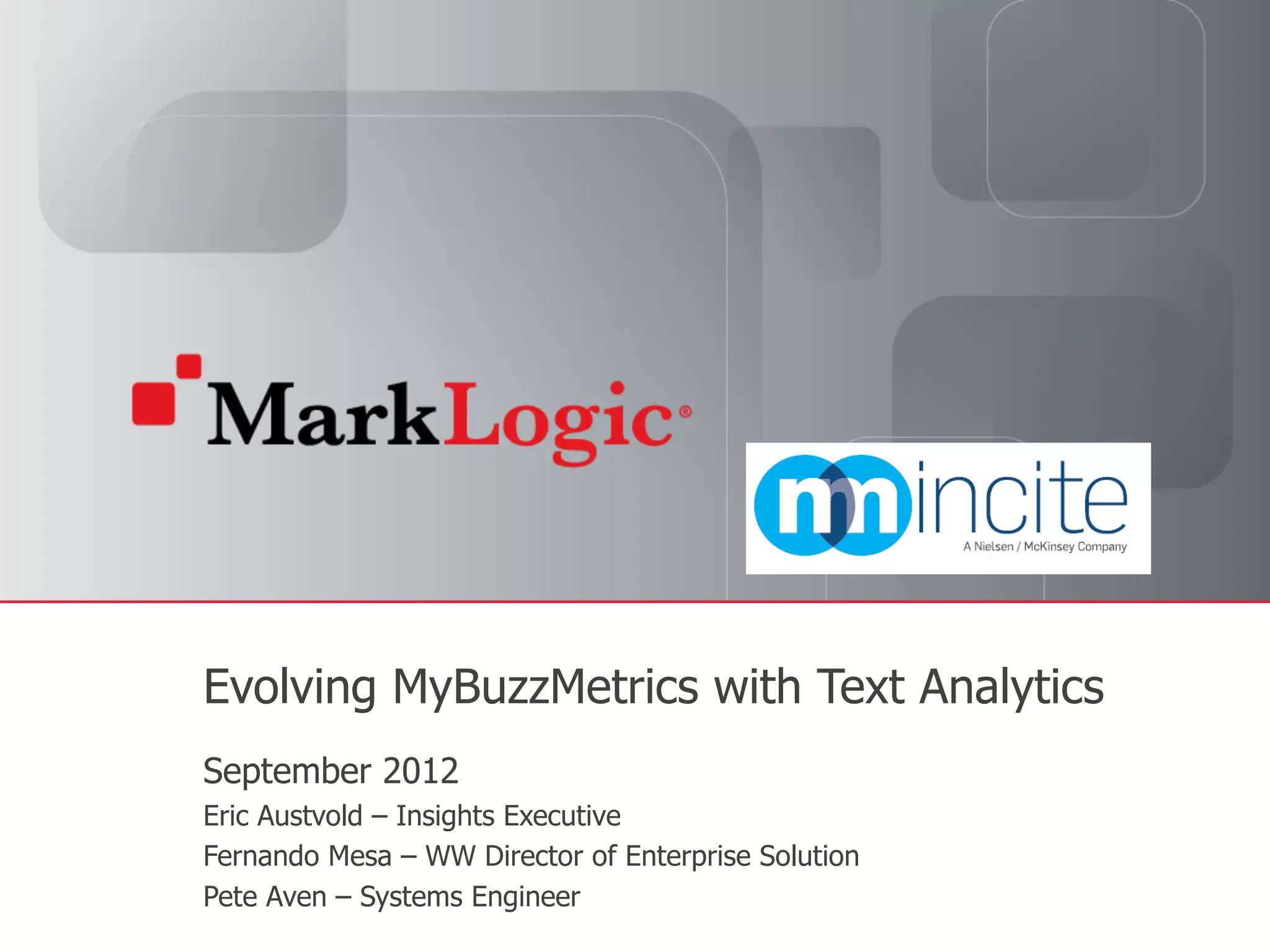 The presentation discusses evolving MyBuzzMetrics, a text analytics solution, using MarkLogic's capabilities. It covers entity extraction, topic discovery, data faceting, trend spotting, and visualization. Demos are provided of these features using real-time queries across large document corpora. Next steps focus on further leveraging MarkLogic's analytics and text mining functions.