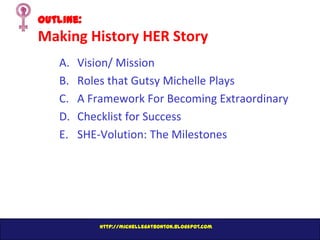 The document outlines a 20-year marketing plan for Gutsy Michelle to become a 21st century heroine. The plan details her vision to inspire women to break stereotypes and pursue their dreams. It outlines the roles she will play as a daughter, sister, professional and more. It provides guidelines for success including focusing on strengths and responding to challenges with faith. The plan envisions her career path over 20 years growing from roles like daughter and student to positions like CEO and advocate. It aims to start a SHE-volution empowering women through Michelle's example of juggling multiple roles with independence.
