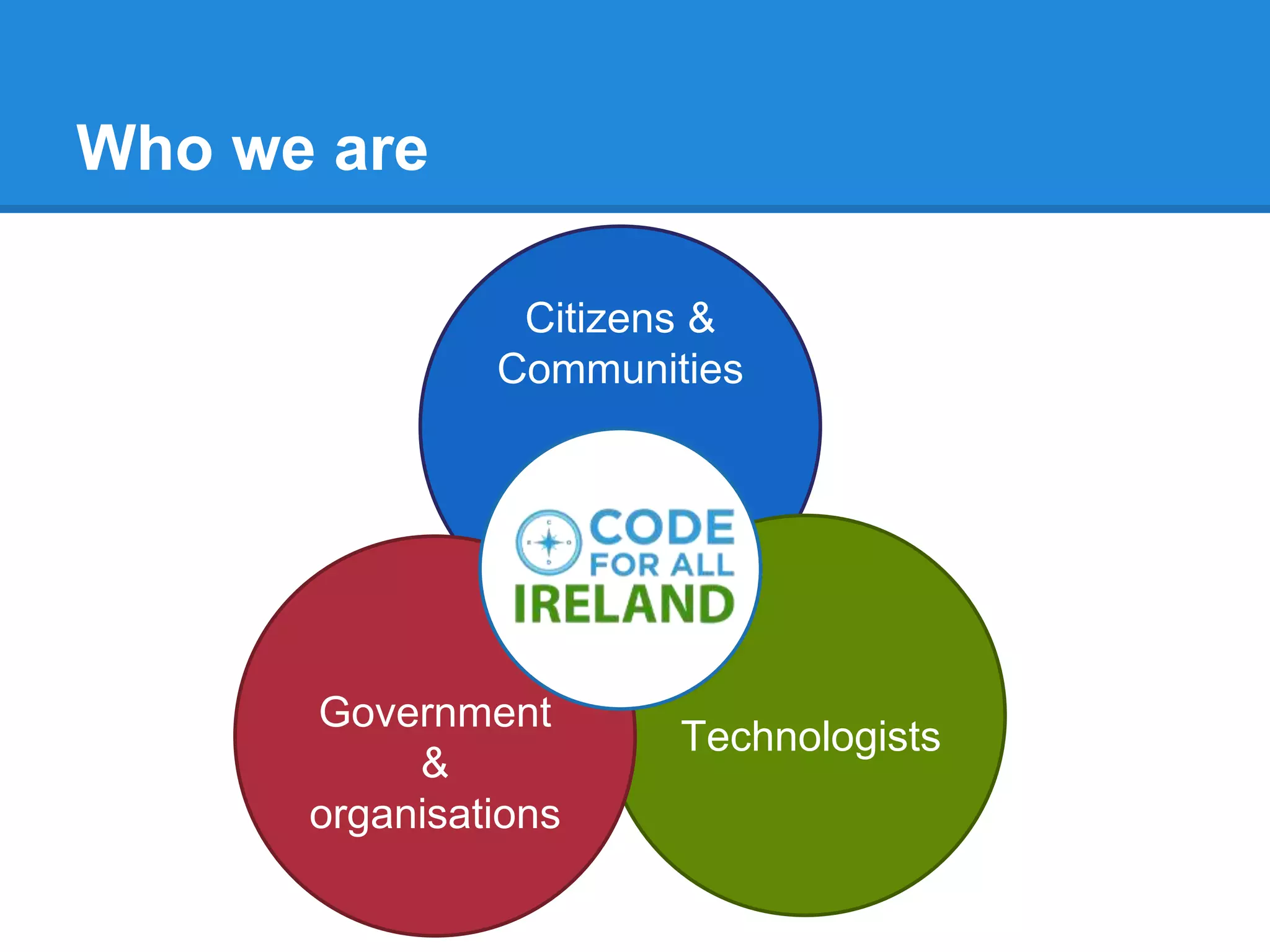 The document discusses the initiatives of Code for Ireland, led by Mark Montgomerie, focusing on developing technology solutions for communities. It emphasizes values such as open source, open data, transparency, and inclusivity in problem-solving. The document invites collaboration and highlights various technological approaches, including analytics, social mobile, and security.
