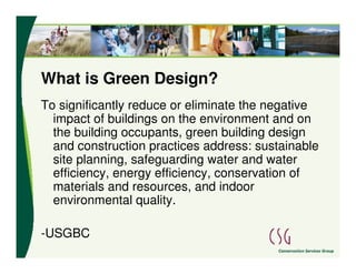 The document discusses green residential building and LEED certification, including what green design entails, an overview of the LEED for Homes rating system and categories, and case studies of 3 homes in Massachusetts that received LEED certification at different levels for their sustainable features like energy efficiency, use of renewable energy and recycled materials, and low-impact site design.
