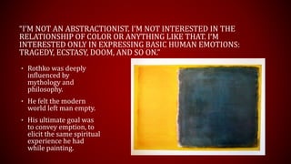 Mark Rothko rejected being called an abstractionist, instead seeing his work as conveying basic human emotions like tragedy and ecstasy. He felt the modern world left people empty and his goal was for his paintings to elicit a spiritual experience for the viewer as he experienced while painting. Rothko eventually abandoned figures as he felt they could no longer convey emotion after World War 2. He was deeply concerned with how his large-scale paintings were presented to viewers, wanting them displayed at eye-level to share an intimate experience rather than being decorative. Rothko ultimately accepted a commission for The Rothko Chapel to create a non-denominational space for meditation and reflection on life.