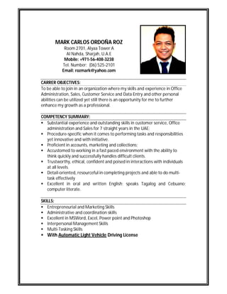 Mark Carlos Ordoña Roz is seeking a position that utilizes his skills in office administration, sales, customer service, and data entry. He has over 7 years of experience in these areas while working in the UAE. His experience includes roles as an office administrator, secretary, receptionist, data entry personnel, and salesperson for Falcon Pack Industry in Sharjah, UAE. He also has experience as an account officer and sales executive for a novelty and gift company in Dubai from 2008 to 2013.