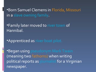 The document provides biographical information about Mark Twain and summarizes his most famous work, Adventures of Huckleberry Finn. It notes that Twain was born in Missouri in 1835 to a slave-owning family, later moved to Hannibal where he became a riverboat pilot, and began writing under the pen name "Mark Twain." Adventures of Huckleberry Finn was published in 1885 and is considered one of the Great American Novels. The book satirizes Southern society and provides critical commentary on racism through the story of Huck Finn and Jim, a runaway slave. It remains very controversial due to its racial themes and implications.