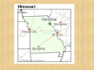 Mark Twain, born Samuel Clemens in 1835, was an American author and humorist known as the "Grandfather of American Literature." He grew up in Hannibal, Missouri where many of his childhood experiences inspired his most famous works, The Adventures of Tom Sawyer and Adventures of Huckleberry Finn. Throughout his career, Twain wrote numerous books, short stories, letters and sketches that satirized society and used regional dialects of the American South and Midwest. He remains one of the most important American authors and his works have had a significant influence on literature and culture.