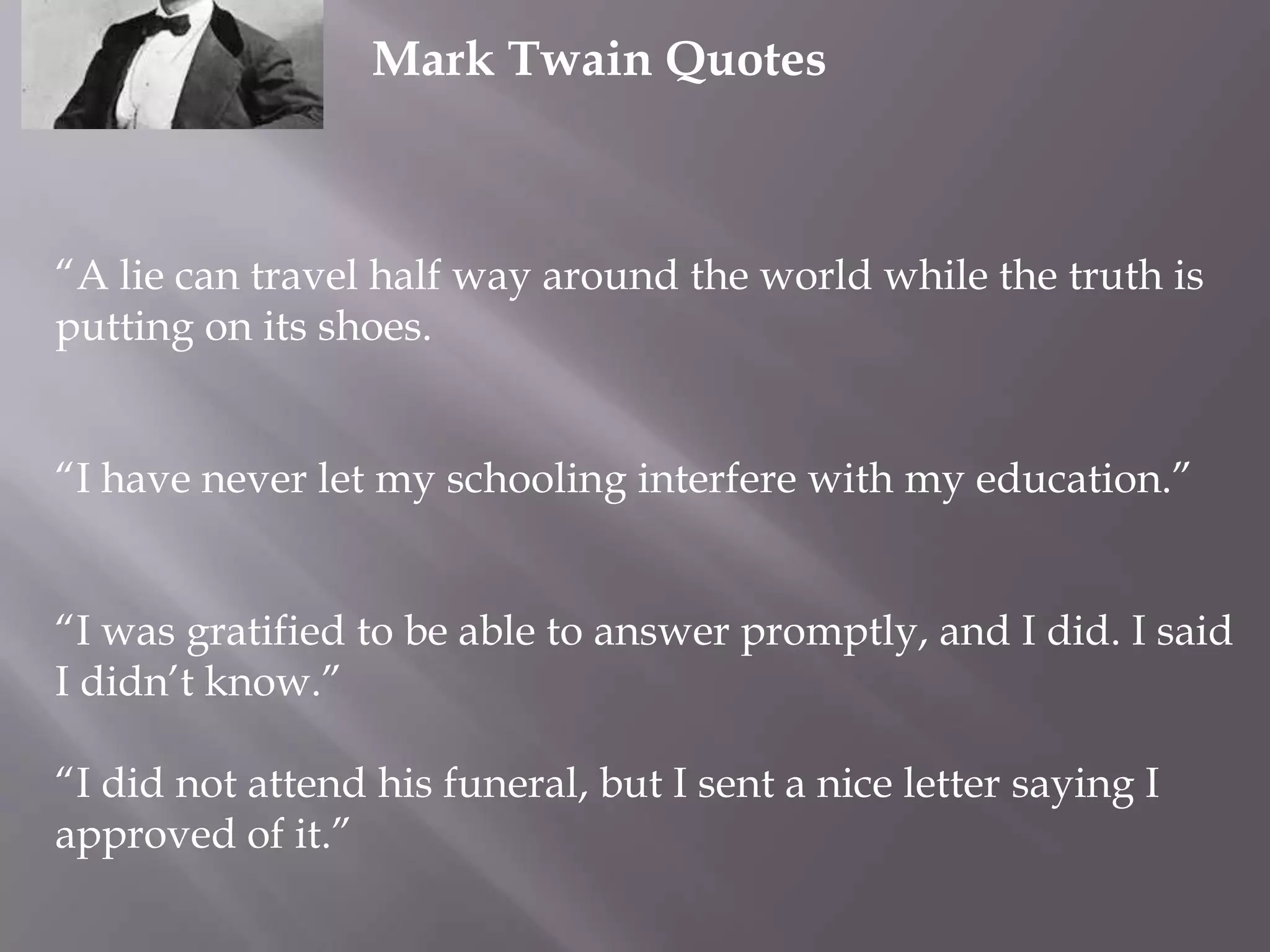 Mark Twain is known for his witty quotes about lies spreading faster than the truth, not letting formal schooling limit one's education, and approving of a funeral by sending a nice letter instead of attending.