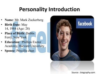 This document summarizes key information about Mark Zuckerberg, the CEO and co-founder of Facebook. It outlines his education background, career highlights such as founding Facebook and its growth, achievements like being named Person of the Year by Time magazine, and his contribution to developing Facebook into a platform with over 1 billion users. It also notes his early interest in computers and creating programming as a child that foreshadowed his future success.
