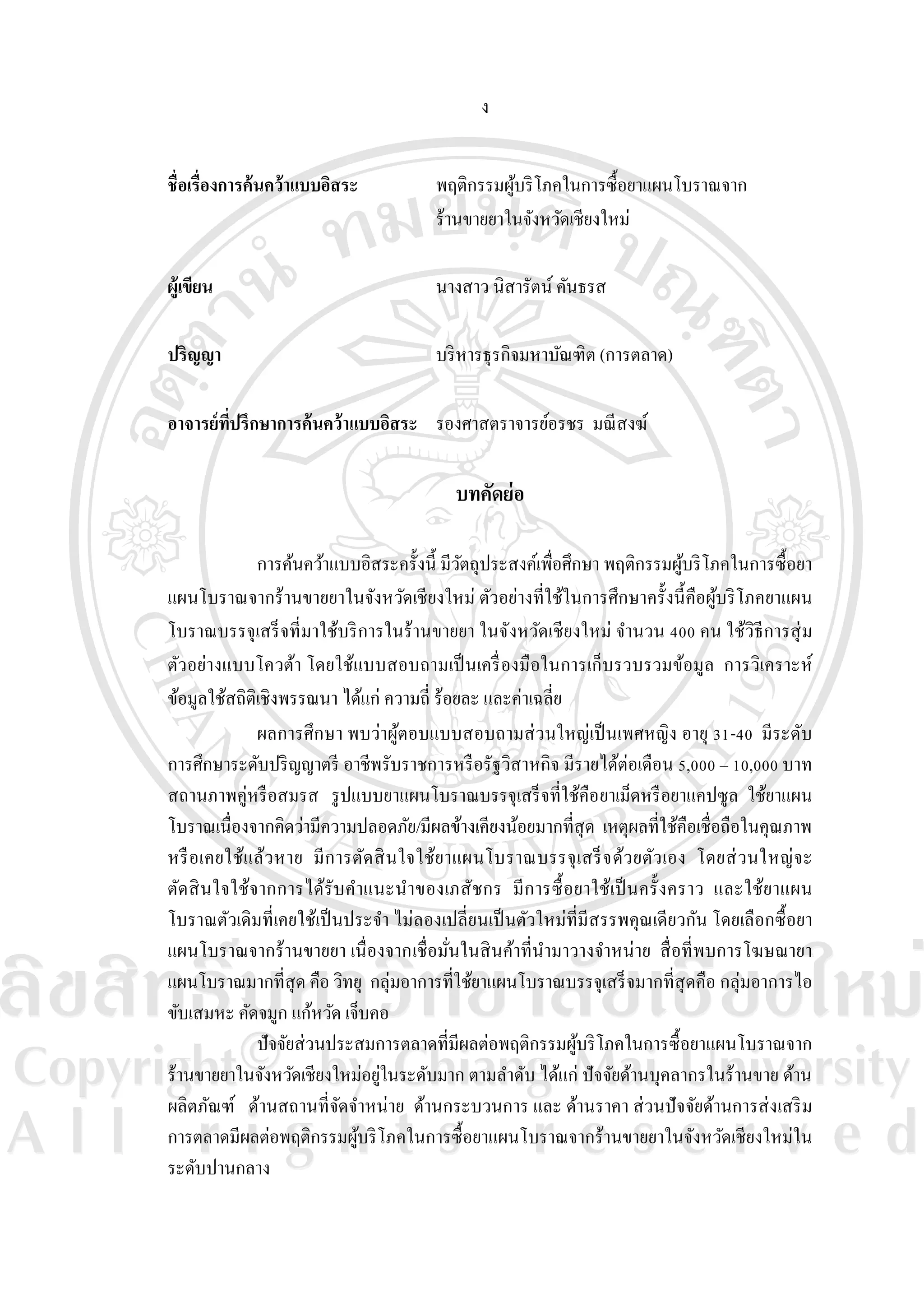 behavior towards purchasing Thai traditional nostrum from the drug stores in Chiang Mai at