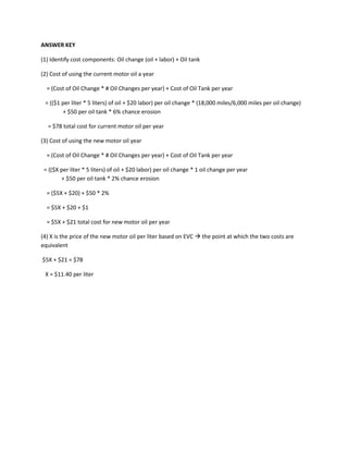 The document discusses calculating the equivalent value cost (EVC) price for a new motor oil called Novel. It outlines the costs associated with the current motor oil which needs changing every 6,000 miles, versus the new oil which only needs changing annually. The EVC price is the price per liter that makes the customer indifferent between the current and new oil costs given the new oil reduces oil changes and chance of tank erosion. Based on provided costs, the maximum EVC price per liter of the new Novel motor oil is $11.40.