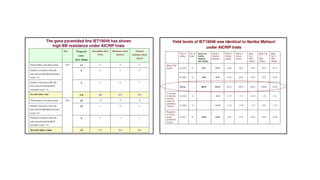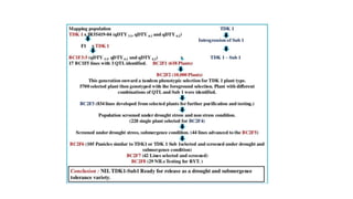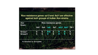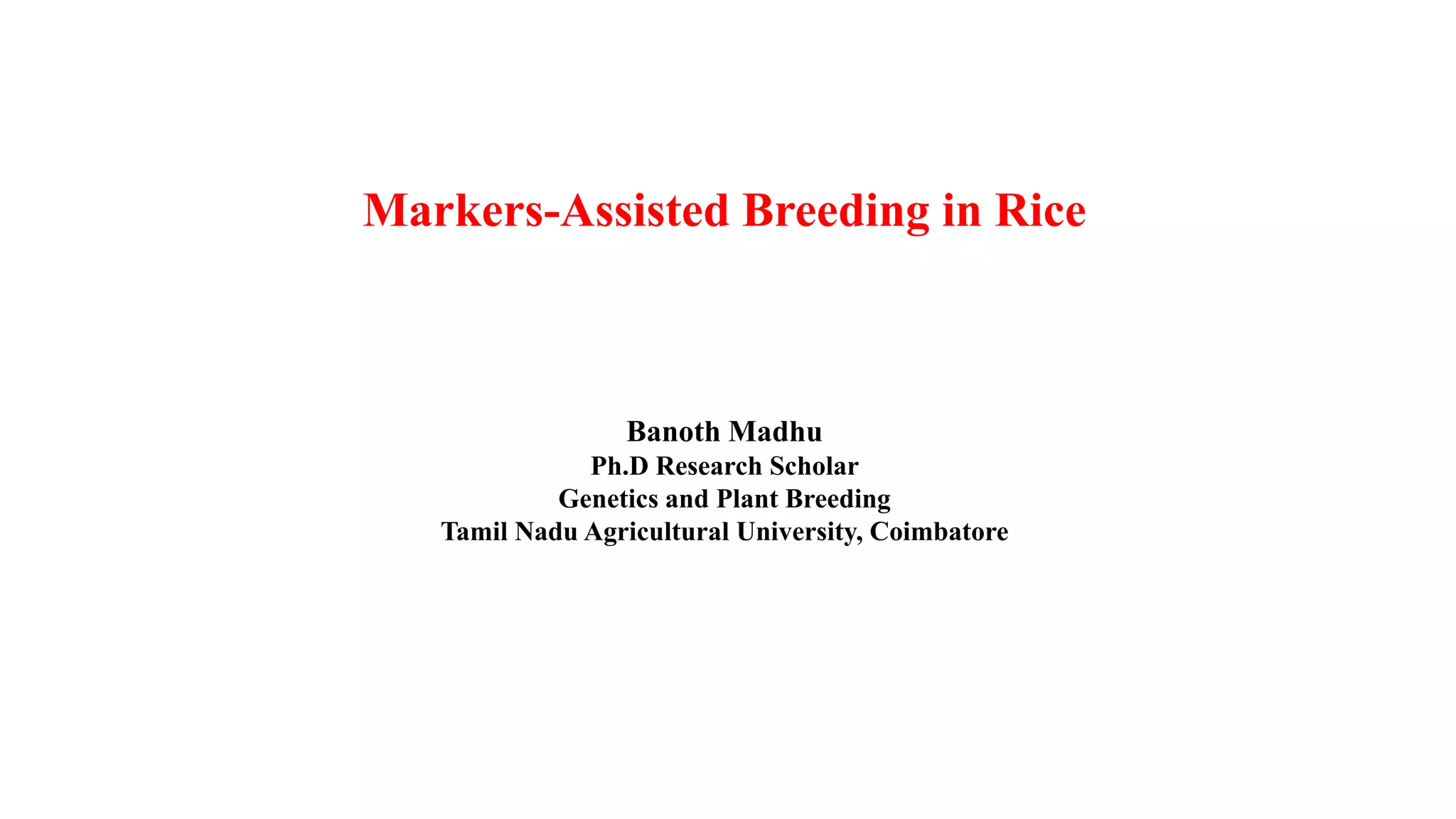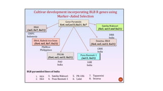 The document discusses marker-assisted breeding methods in rice, highlighting their advantages for selecting desirable traits and increasing efficiency in breeding programs. It presents multiple case studies on the successful integration of disease resistance genes into prominent rice varieties in India, showcasing techniques like marker-assisted backcrossing and pyramiding. The research emphasizes the importance of early generation selection and combining traits to enhance yield and resilience against environmental stressors.