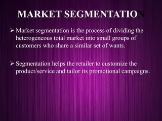 Market segmentation involves dividing the total market into groups of customers with similar needs and wants. This allows retailers to customize their products, services, and promotional campaigns for each segment. Effective segmentation criteria includes segments that are homogeneous within themselves but heterogeneous from each other, substantial in size, actionable to identify customers, accessible to target, and measurable. Segmentation helps retailers with development of marketing mix, store location decisions, understanding customer behavior, merchandising decisions, and promotional campaigns.
