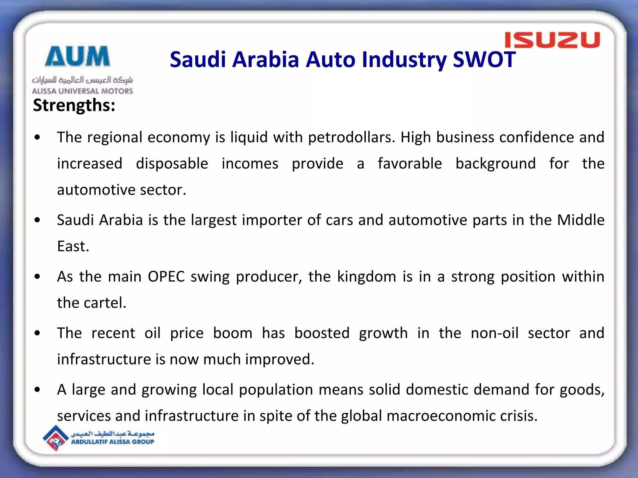 The Saudi Arabia auto industry has strengths in its liquid regional economy from petrodollars that boost business confidence and disposable incomes. However, it also has weaknesses in that there is no local production and dependence on oil leaves growth vulnerable to price shifts. Opportunities exist in opening the market to more European imports through trade deals.
