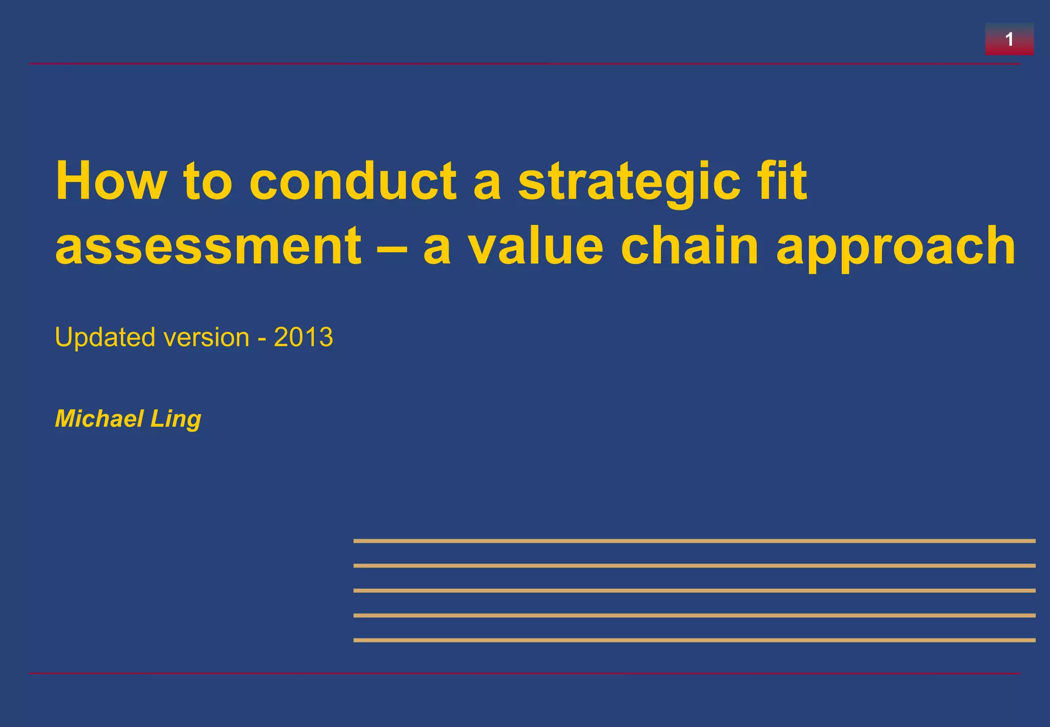 The document provides a framework for conducting a strategic fit assessment using a value chain approach. It involves high-level assessment of an organization's current assets, capabilities, and commercial relationships. It then assesses these elements for different strategic options. Gaps are identified for each option and priorities set for closing gaps internally, through acquisitions, or partnerships. The framework allows conclusion of strategic options based on overall fit with key issues and suggests next steps.