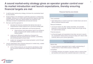 Analysys Mason has developed a systematic approach to creating effective market entry strategies. The approach involves comprehensive analysis of the market, competitors, regulations and internal assets. It results in a clear strategy that establishes objectives, positioning, target segments and strategic directions. Analysys Mason then develops detailed tactical plans covering pricing, branding, sales, products and launch phasing to enable efficient implementation and control market introduction. The structured process and coordination between strategy, business planning and technical teams helps ensure a coordinated market entry.