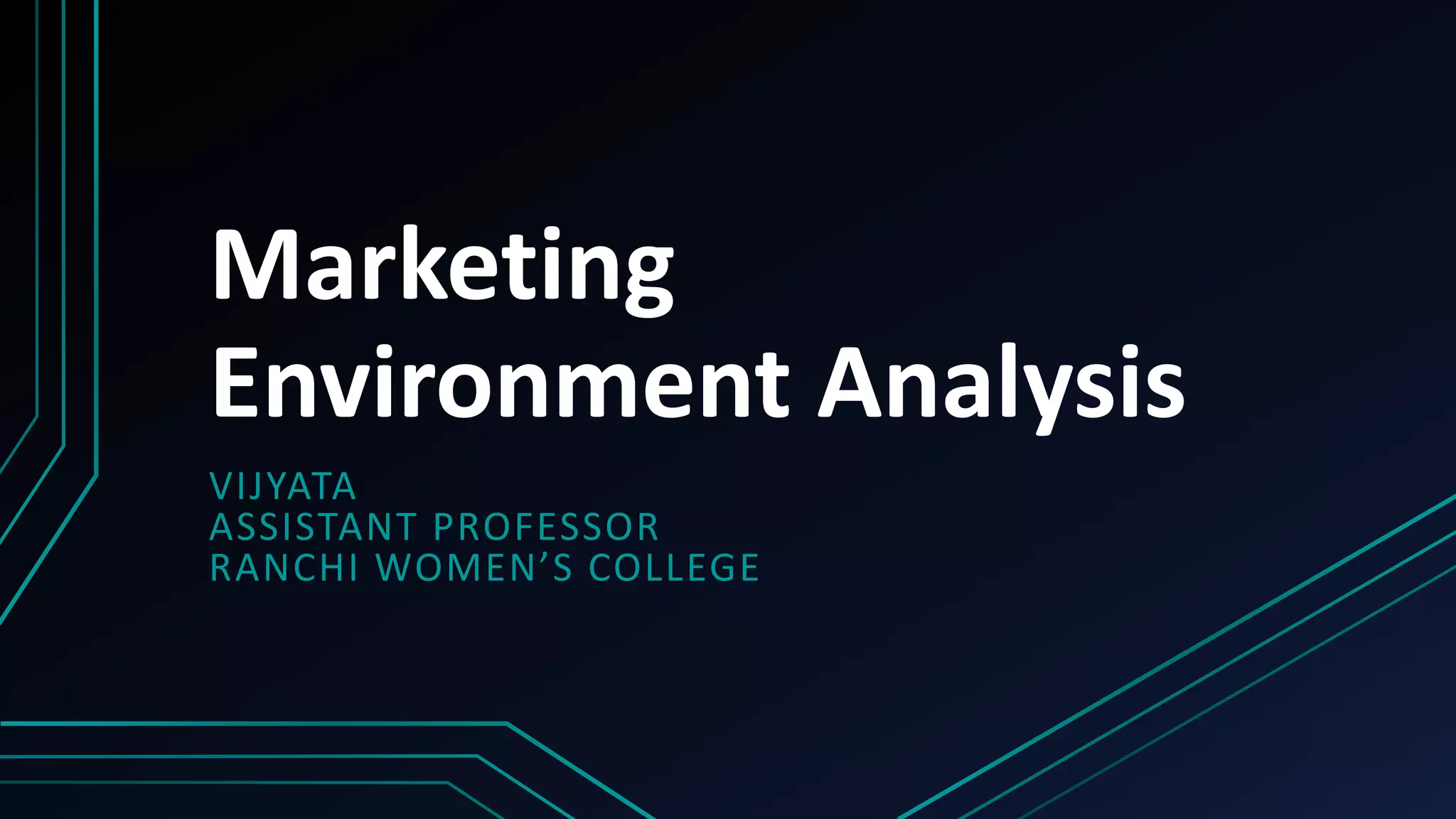 This document provides an overview of tools for analyzing a company's marketing environment, including SWOT analysis and Porter's Five Forces model. SWOT analysis involves examining a company's strengths, weaknesses, opportunities, and threats. Porter's Five Forces model analyzes the bargaining power of buyers and suppliers, threat of substitutes, threat of new entrants, and rivalry among existing competitors. The document was created by an assistant professor to provide guidance on marketing environment analysis.