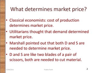 1. The document discusses market equilibrium, which occurs at the price where the quantity demanded equals the quantity supplied. Both supply and demand factors are needed to determine the equilibrium price and quantity.