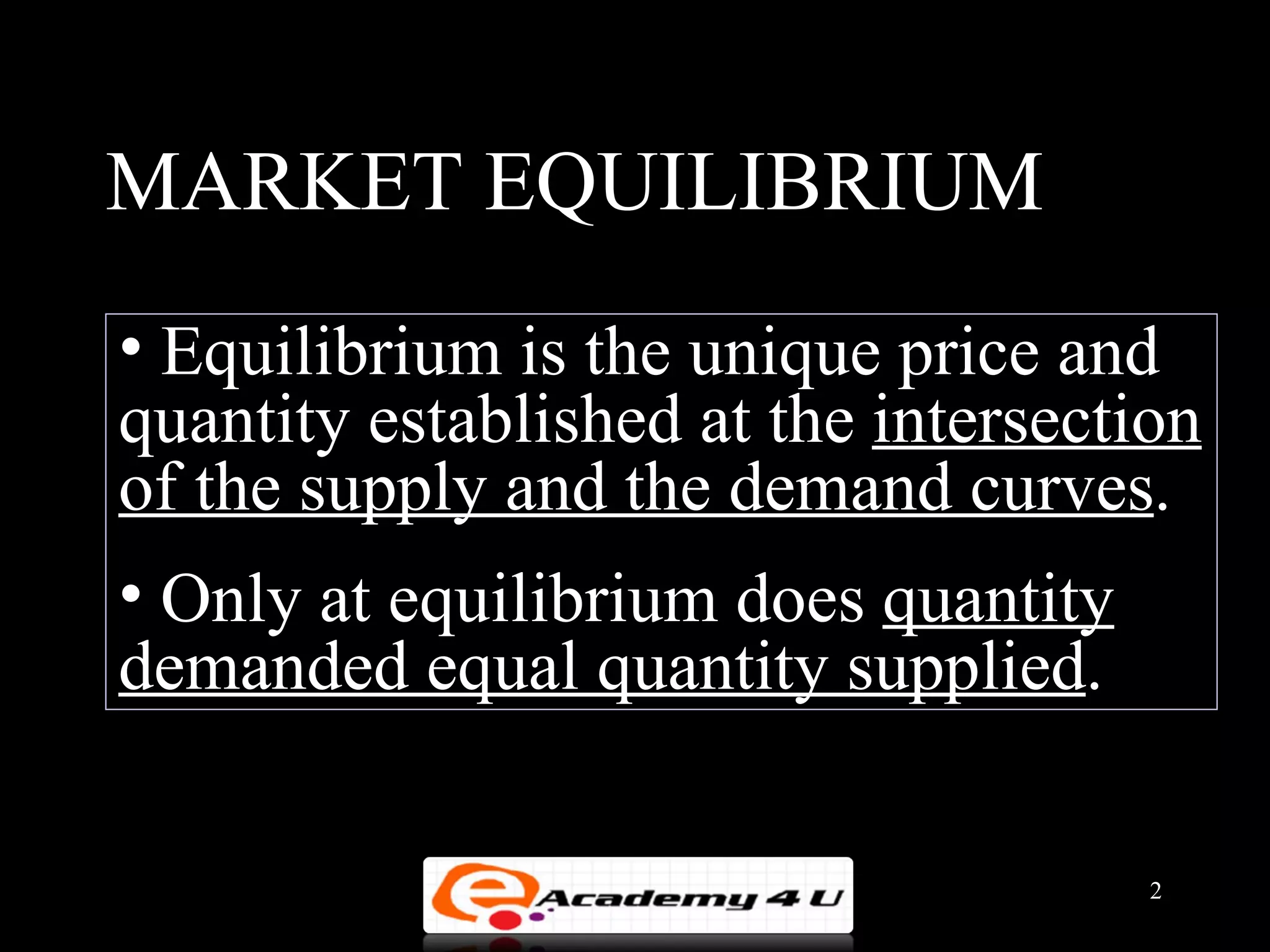 1. Market equilibrium is reached at the price where quantity demanded equals quantity supplied.