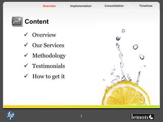 This document provides an overview of market intelligence services offered by Lemon Sales to analyze various aspects of products, customers, distribution channels, and employees. It describes the target audience and data collection methods. Key services include research on product marketing, distribution channels, customer satisfaction, customer services, and assessing employees. The implementation process involves discovery, toolbox design, execution, and presenting findings. Lemon Sales has tools, consultants, and experience working with large companies on multi-country projects.