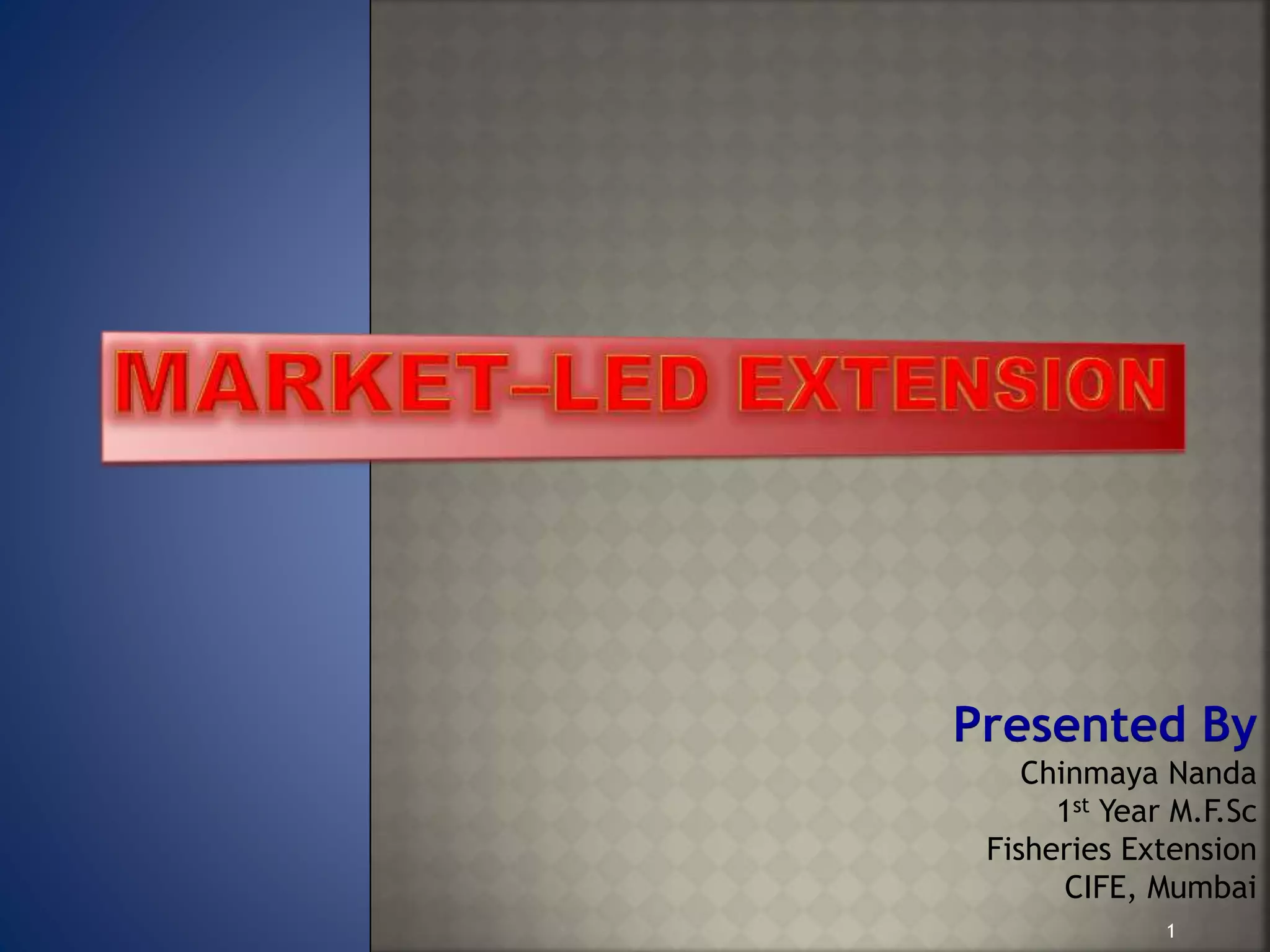 The document discusses the shift from production-led extension (PLE) to market-led extension (MLE) in fisheries to improve farmers' profitability through better market strategies and information. It highlights the importance of addressing challenges such as market size, price fluctuations, and communication skills while enhancing farmers' capacities in a globalized market. Recommendations include establishing direct marketing, providing market intelligence, and training extension workers to support farmers in accessing lucrative market opportunities.