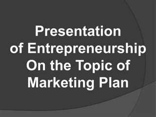 This document provides an overview of a group presentation on marketing plans. It discusses key marketing concepts like the marketing mix, 4Ps and 4Cs, target marketing, market segmentation, and marketing strategies. It then gives definitions and examples for each concept. The document outlines developing a marketing plan for a new Columbia Sportswear product - expanding into the snowboard and equipment industry. It analyzes the industry, identifies Columbia's strengths and weaknesses, and provides recommendations around market segmentation, goals, product details, and ensuring product performance.