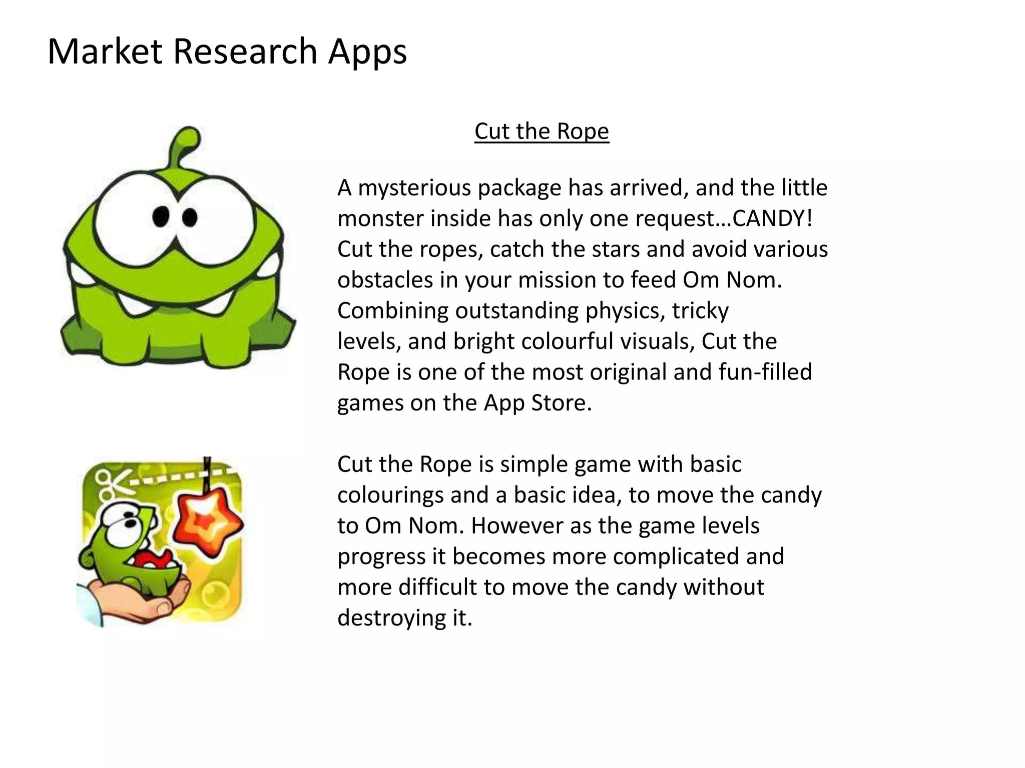Cut the Rope is a puzzle game where the goal is to cut ropes and guide candy to a hungry monster. Where's My Water is also a puzzle game where the player uses switches to guide water through pipes.