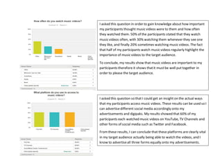 The survey found that the majority of respondents were male, aged 17-25, and watched music videos regularly on YouTube, TV, and social media. Indie/alternative was the most popular music genre. Most preferred music videos to be performance-style, between 3-5 minutes, and incorporate some black and white edits.