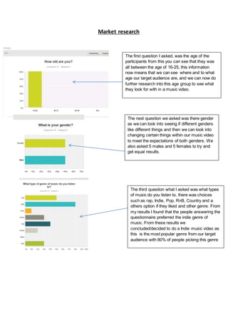 The document summarizes the results of a market research questionnaire about music video preferences among a target audience aged 16-25. Key findings include: