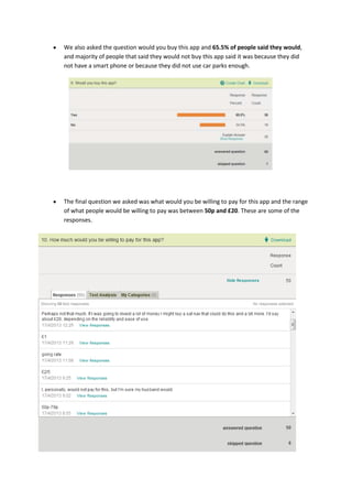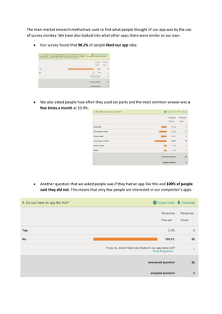 Our market research found that 98.2% of people liked our app idea and 65.5% said they would buy the app. The most common response for how often people used car parks was a few times a month. While alternatives exist like apps that find nearby car parks or use sensors to show availability in London, our app offers more features like showing prices, spaces available, and a "find your car" function nationwide at a potentially lower cost.