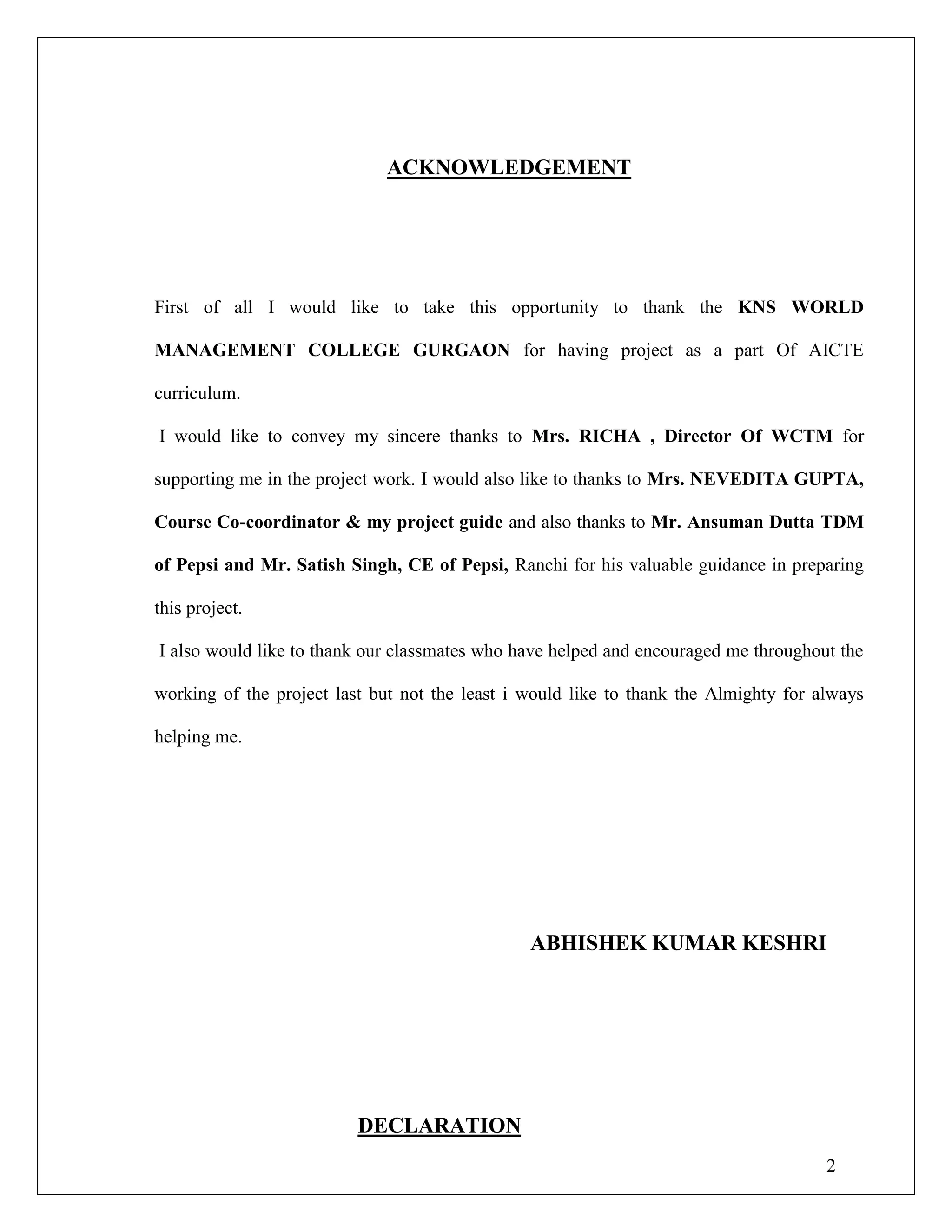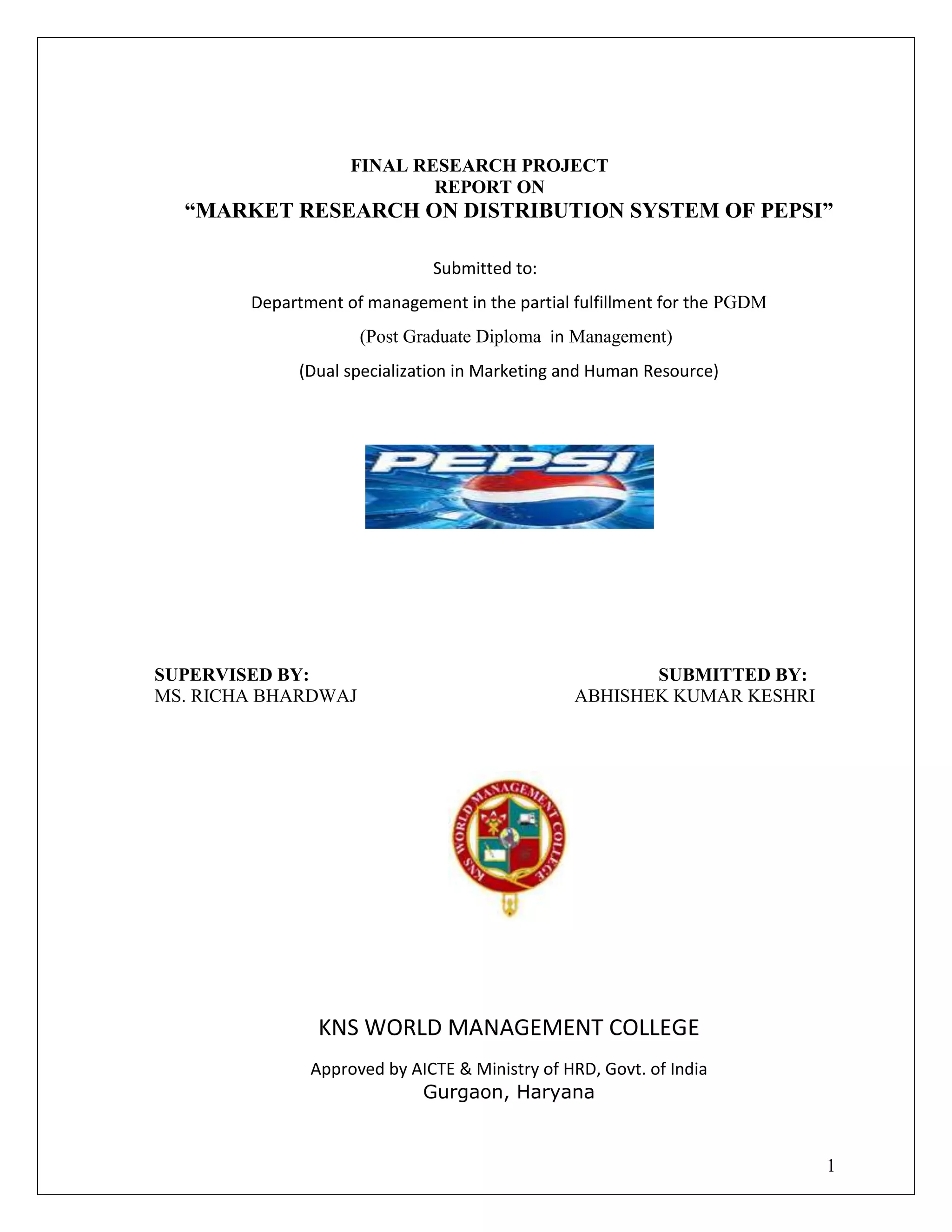 This document provides an overview of a market research project on the distribution system of Pepsi in Ranchi, India. It includes an acknowledgement, declaration, executive summary, list of figures and tables, and index. The executive summary indicates that the project's objectives were to understand Pepsi's market strength, distribution system, sales levels relative to Coke, and market share percentages in Ranchi. Research methods included questionnaires, interviews, and secondary data collection. Key findings showed that 55% of retailers felt Pepsi's distribution was better, and it was the market leader in several Ranchi areas. However, Pepsi stood last in terms of profit for retailers.