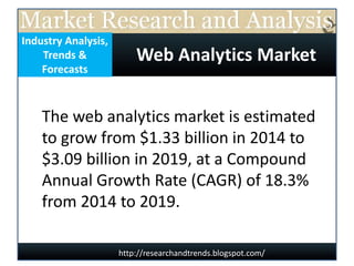 The web analytics market is expected to grow from $1.33 billion in 2014 to $3.09 billion in 2019, representing a compound annual growth rate of 18.3%. New technologies have been developed to meet demand for web analytics, which can be used for purposes such as social media analysis, targeting and behavior analysis, display advertising optimization, and multichannel campaign performance monitoring. Key players in the web analytics market include IBM, Adobe Systems, Oracle, SAS, Google, and Yahoo.