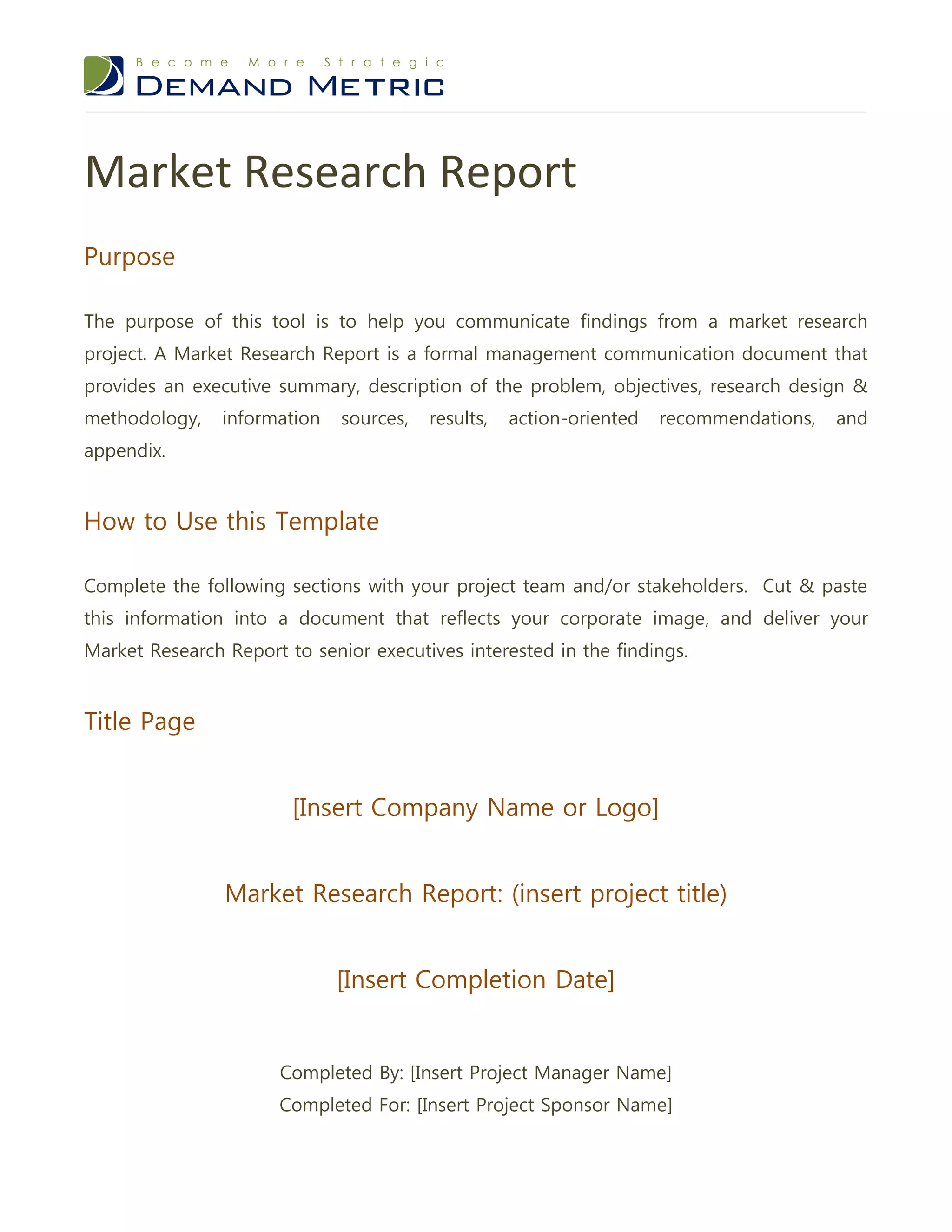 This market research report summarizes findings from a study aimed at understanding key questions about the target market, competitive advantages, and effectiveness of marketing campaigns. The report includes an executive summary of key findings, description of research objectives and methodology used, detailed results of the study, and action-oriented recommendations. Research methods included surveys, focus groups, and stakeholder interviews. The implications of the results provide opportunities and risks for the organization. The recommendations propose a three-step action plan and appendix includes all research tools used in the study.