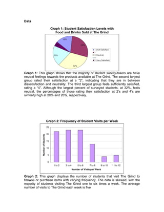 The document analyzes market research conducted on high school students at the International School of Bangkok to determine ways to increase revenue for the on-campus coffee shop, The Grind. Surveys found that most students have neutral satisfaction with food/drinks and visit 5 times/week during lunch. The analysis suggests increasing student satisfaction and introducing new products, like smoothies and snacks, could attract more customers at currently low traffic times and increase total weekly purchases and revenue. Recommendations include adding new food/drink options tailored to different day-parts and promotional campaigns.