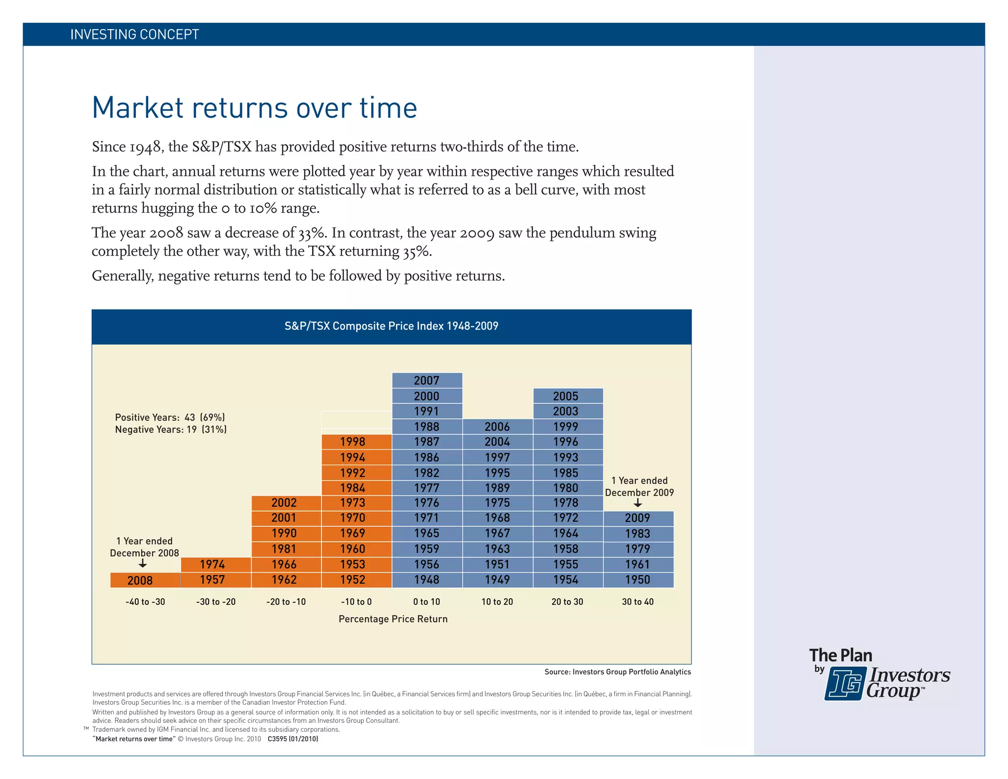 - The S&P/TSX provided positive returns about two-thirds of the time, with most returns between 0-10%.