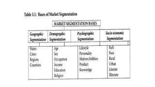 The document discusses market segmentation, which is the process of dividing a heterogeneous market into homogeneous subgroups. It involves identifying distinct groups that have distinct needs, characteristics, or behaviors. The key benefits of segmentation include allowing companies to better understand customer needs, develop differentiated products and services for each segment, focus marketing efforts on the most profitable segments, and avoid wasting resources on segments that are not viable. The document outlines the main bases used for segmentation, including demographic, geographic, psychological, and behavioral factors. It also discusses the advantages and disadvantages of market segmentation.
