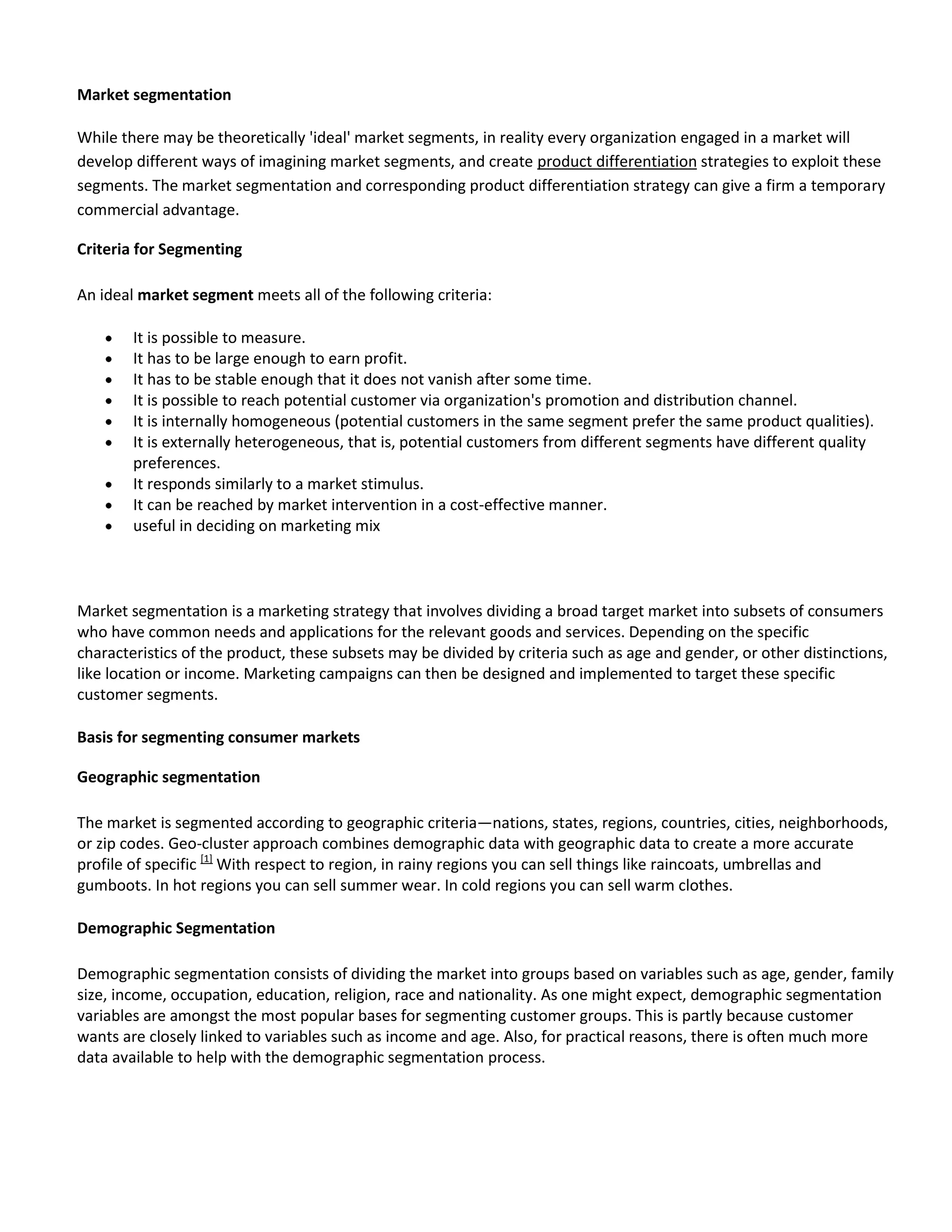 Market segmentation involves dividing a broad target market into subsets of consumers who have common needs and applications for relevant goods and services. The document discusses criteria for effective market segments and various bases for segmenting consumer and industrial markets, including geographic, demographic, psychographic, and behavioral factors. Segmentation allows firms to better understand customer diversity and satisfy customer needs through targeted marketing strategies.