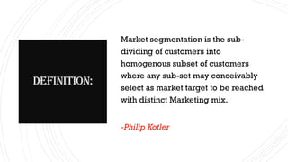 1. The document discusses various types of market segmentation including geographic, demographic, psychographic, and behavioral segmentation.