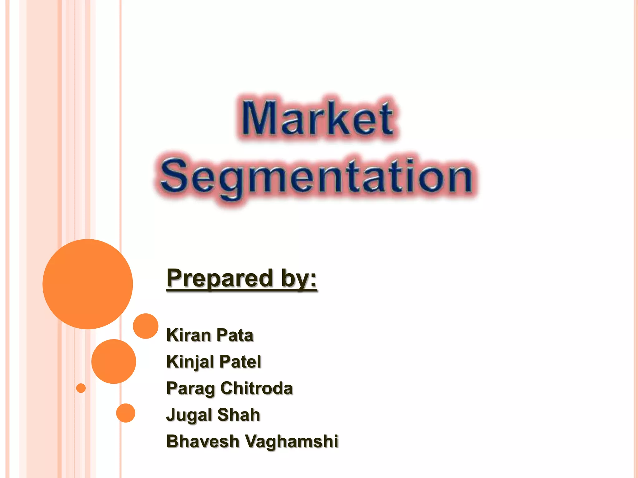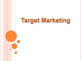 This document discusses market segmentation and target marketing. It begins by defining market segmentation as dividing a large market into smaller groups with common characteristics. There are various bases for segmentation including geographic, demographic, psychographic, and behavioral factors. The document then discusses different levels of segmentation from broad segments to niche and individual marketing. It provides examples of companies targeting segments. Finally, it covers strategies for selecting target markets such as focusing on one segment, several segments, one product across segments, or aiming for total market coverage.
