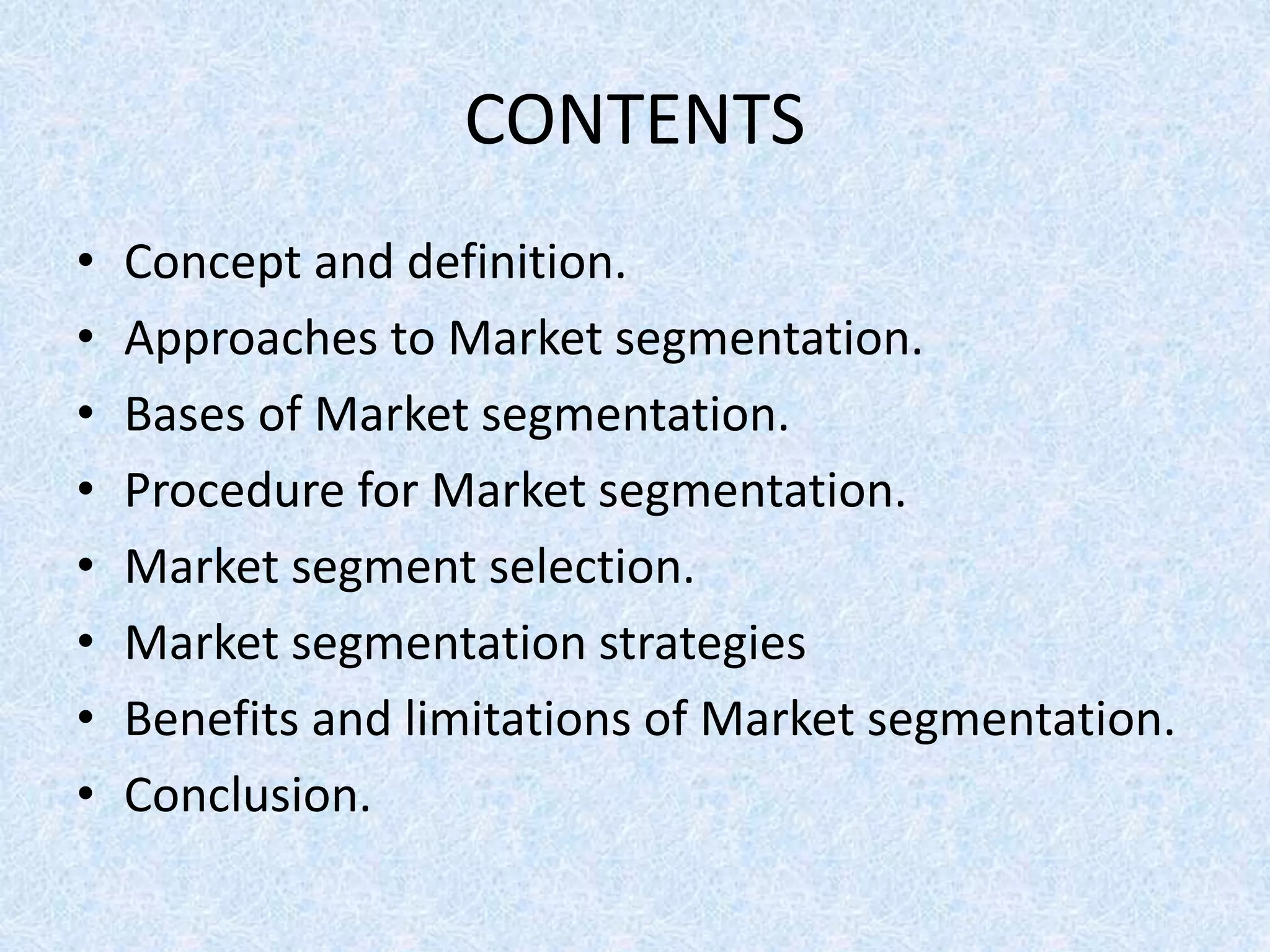 The document also discusses different bases for segmentation such as geographic, demographic, psychographic, and behavioral segmentation. It provides examples of how companies segment based on these criteria. Finally, it covers procedures for segmentation, selecting market segments, segmentation strategies, and benefits and limitations of segmentation.