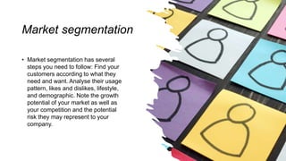 Market segmentation involves dividing a market into subgroups of consumers with similar needs, characteristics, or behaviors. It includes segmenting by geography, demographics, psychographics, and behaviors. Some key types of segmentation are geographic, which divides based on location; demographic, which divides based on attributes like age, income, gender; psychographic, which divides based on attitudes and lifestyles; and behavioral, which divides based on purchasing behaviors and decision making processes. Once segmented, companies can target specific groups and position their products to appeal most to the desired segments.