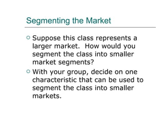 The document discusses different ways to segment a market, including by geographic, demographic, psychographic, and behavioral variables. Some key variables mentioned are age, gender, income level, family size, hobbies, lifestyle, usage rate, and brand loyalty. Marketers analyze these characteristics to divide the overall market into smaller segments with similar needs, then target their products and marketing appropriately.