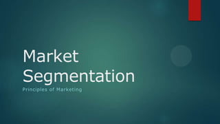 Market segmentation involves dividing a market into distinct groups based on characteristics like geography, demographics, psychographics, and behaviors. The key benefits are identifying new product opportunities, designing effective marketing programs for homogeneous groups, and improving resource allocation. Segments must be identifiable, accessible, respond uniquely to offerings, be large enough to target, and relatively stable over time. Common bases for segmentation include geographic variables, demographics like age and income, psychographic lifestyle assessments, and behavioral factors.