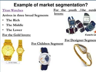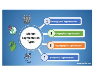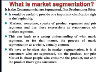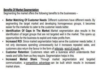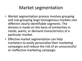 Market segmentation involves dividing a large homogenous market into clearly identifiable segments based on similarities in customer needs, wants or demands. Effective segmentation allows companies to personalize marketing campaigns and reduce risk. There are five criteria for effective segmentation - segments must be accessible, differentiable, actionable, measurable and substantial. Segmentation bases include demographic factors like age, gender, income as well as behavioral and psychographic variables. While segmentation has advantages, it also has disadvantages like requiring extensive research and being an expensive process.