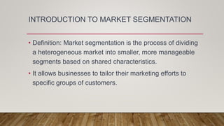 Market segmentation involves dividing a heterogeneous market into smaller, more homogeneous segments based on shared characteristics. It allows businesses to tailor their marketing efforts to specific customer groups. The key bases used for segmentation include demographic factors, geographic location, psychographic traits, behavioral patterns, price sensitivity, and usage rates. Combining multiple bases can provide a more precise segmentation strategy for enhanced customer understanding and improved resource allocation.
