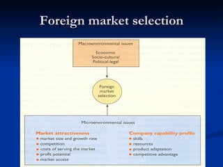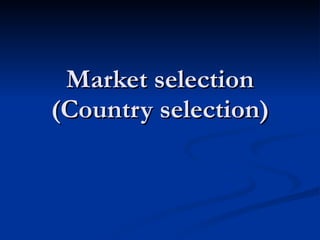 This document outlines the process for selecting foreign markets, including 4 main steps: