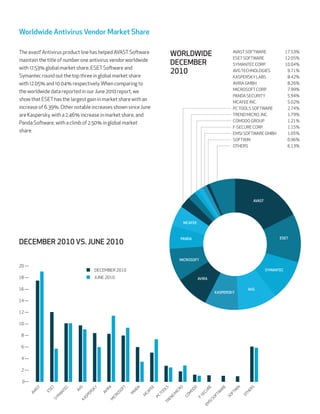 This report provides market share data for antivirus software, Windows operating systems, and backup client software from August 16, 2010 to November 15, 2010. The top three antivirus vendors worldwide were Avast with 17.53% market share, ESET with 12.05%, and Symantec with 10.04%. In North America, Symantec maintained the top position with 16.45% market share. Windows 7 continued growing in adoption, reaching 28.64% of the worldwide Windows market. Nearly 75% of users with backup clients backed up their data weekly or more frequently. Norton had the largest market share of backup client vendors at 26.49%.
