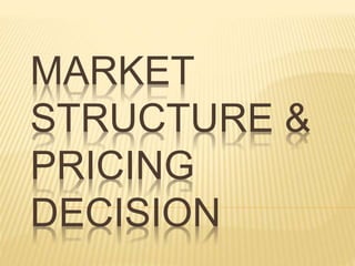 The document discusses different market structures including perfect competition, monopoly, monopolistic competition, oligopoly, and duopoly. Perfect competition is characterized by many small firms, homogeneous products, free entry and exit, and price-taking behavior. A monopoly has a single seller of a unique product in an industry with high barriers to entry. Monopolistic competition involves differentiated products that are close substitutes. Oligopoly describes an industry with a small number of large firms where the actions of one influence others. Duopoly is a specific type of oligopoly with only two firms controlling the market. Examples of each market structure are provided.