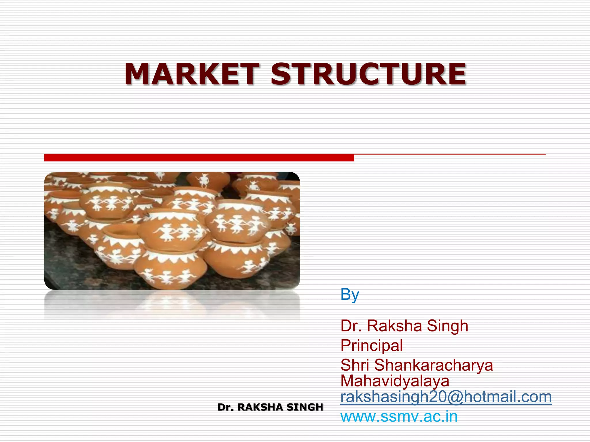 This document discusses market structure and its various forms. It defines a market and lists its key features such as buyers and sellers, competition, interaction, existence of commodities, price, and knowledge. The document then classifies markets based on area, nature of transactions, volume of business, time period, level of regulation, and sellers. It also discusses different forms of market structure from perfect competition to monopoly based on the number of firms and level of product differentiation. Concentration and its effect on competition are explained. Finally, some Hindi translations of market structure terms are provided.