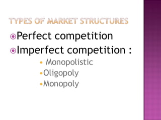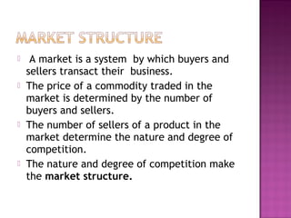 - Under perfect competition there are many small buyers and sellers of homogeneous products, with free entry and exit from the market. Firms are price takers and competition is based on price.