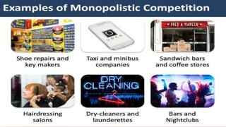 The document discusses different types of market structures in economics, including perfect competition, monopoly, monopolistic competition, and oligopoly, focusing on their characteristics, implications for competition, and pricing. It explains the concepts of price discrimination, collusive oligopoly, and unique market conditions such as monopsony and duopoly. Each market structure has distinct features influencing the number of firms, product nature, and demand curve faced by firms.